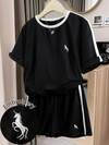 Franclia Plus Size Embroidered Logo Shorts & Solid Color Long Sleeve Shirt 2 Pieces Set