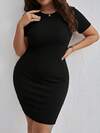 SHEIN Essnce Plus-Size Women's Spring/Summer Fashionable And Elegant Stretchy Comfortable Everyday Basic Versatile Slimming Black Short-Sleeved Mini Dress,Bodycon,Summer Outfits,Curve Dress,Minimalist Style
