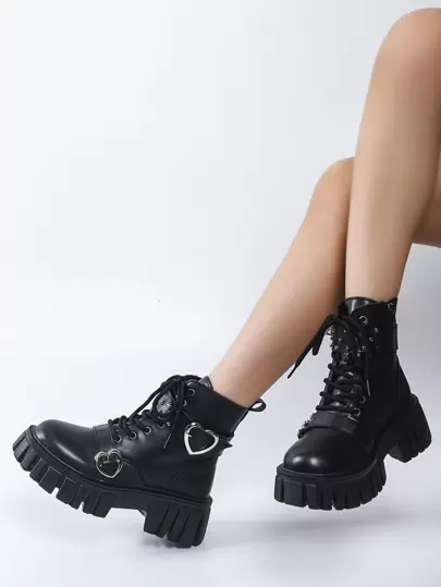 Fall/Winter 2025 Wear With Shorts,Buckle & Studded Decor Lace-Up Front Zipper Side Combat Boots, Black Punk Rivet Decorated Buckle Solid Color Women's Fashionable Boots,Platform Heels For Women - Black - View 1