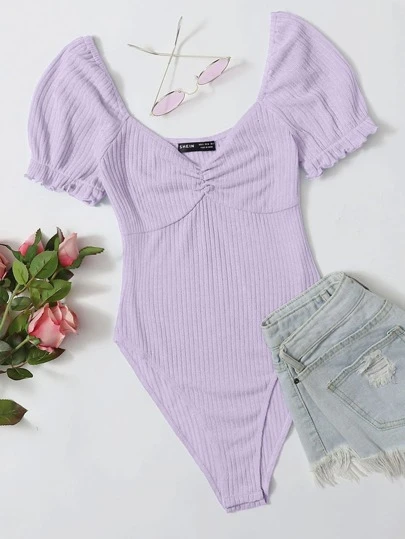 SHEIN EZwear Frilled Puff Sleeve Ruched Bust Rib-knit Bodysuit - Lilac Purple - View 1