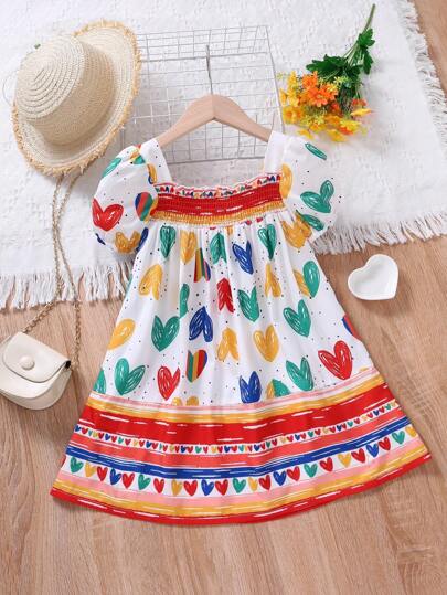 SHEIN Young Girls Vacation Regular Shoulder Puff Sleeve High Waist A-Line Heart Print Dress, Summer - Multicolor - View 1