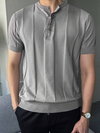 DAZY Men Seam Detail Half Button Knit Top - Light Grey - View 1