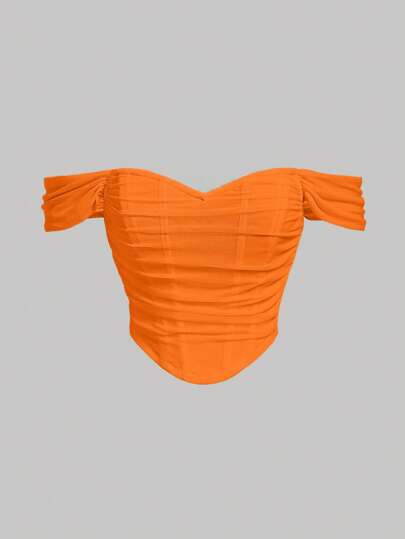 SHEIN MOD Off Shoulder Ruched Mesh Top - Burnt Orange - View 1