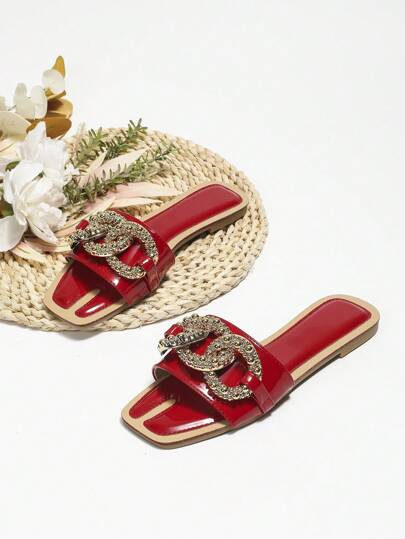 Summer Casual Fashionable Anti-skid Square Toe With Metal Buckle Flat Sandals - Red - View 1