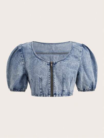 SHEIN MOD Zip Up Puff Sleeve Crop Denim Top - Medium Wash - View 1