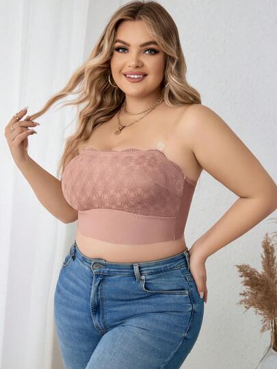 Plus Size Dusty Pink Plain Scallop Contrast Lace Strapless Bra Top For Women Medium Stretch Fabric - Dusty Pink - View 1