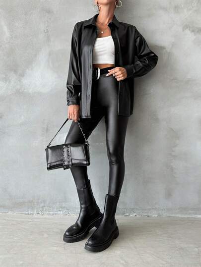 EURMUSE Drop Shoulder PU Leather Coat - Black - View 5