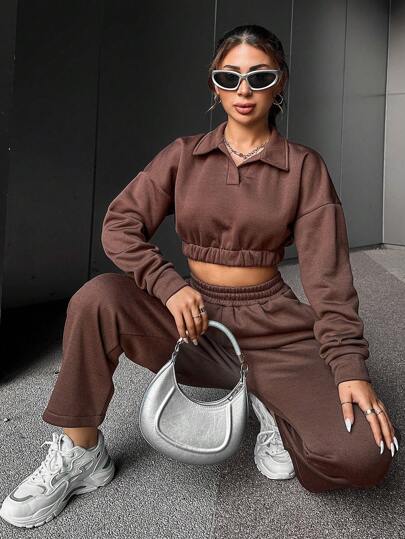 EURMUSE Drop Shoulder Crop Sweatshirt & Sweatpants - Brown - View 1