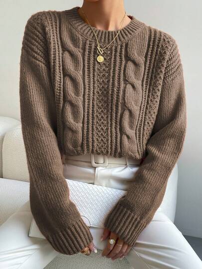 Chiquease Cable Knit Drop Shoulder Sweater,Long Sleeve Tops Knit Pullover Fall Winter Outfit - Khaki - View 1