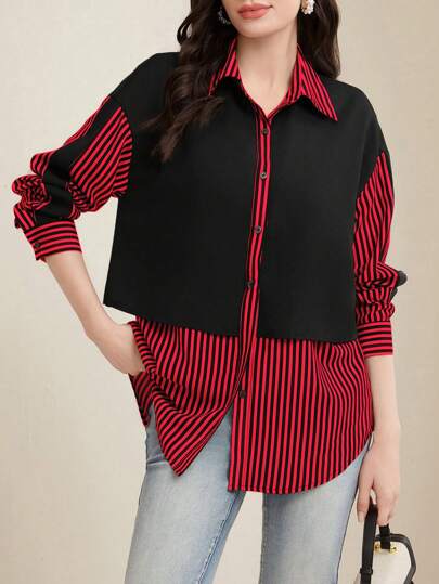 SHEIN Unity Striped Button-Front Shirt With Patchwork Design - Red and Black - View 1