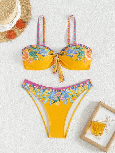 SHEIN Swim Summer Women's Full Print Cami Neck Bikini Set With Knot Music Festival - Multicolor - View 1