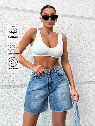 CasuGlow 100%Cotton Women's Frayed Straight-Leg Denim Shorts - Medium Wash - View 1