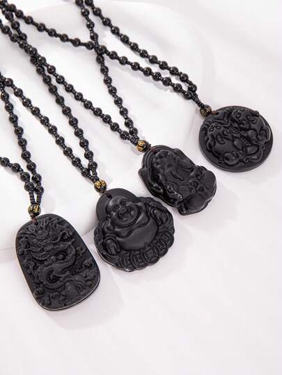1pc Chinese Style Obsidian Stone Dragon Pixiu God Of Wealth Pendant Necklace - Black - View 1