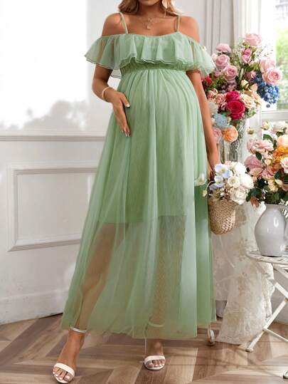 SHEIN Maternity Elegant Romantic Double Layered Ruffle Sleeve Dress, Suitable For Gender Reveal Party - Olive Green - View 1