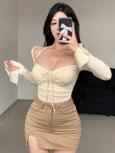 DAZY Solid Color Pleated & Belt Design Slim Fit Long Sleeve T-Shirt Going Out Tops,Fall Clothes,Back To School Clothes - Beige - View 1
