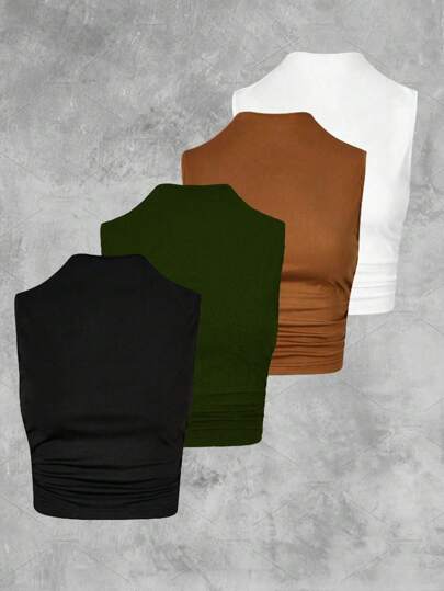 Calvaya Plus Size Solid Color Sleeveless Top With Pleats & Stand Collar, Spring/Summer - Multicolor - View 3