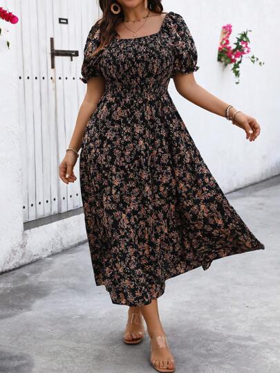 SHEIN LUNE Plus Size Women Fashionable Summer Square Neck Floral Dress - Black - View 1