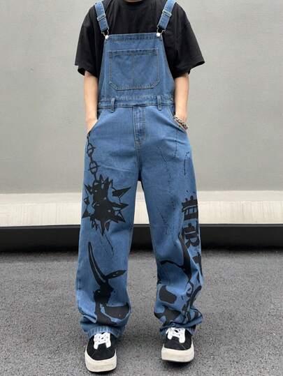 Manfinity Roghcode Men Plain Rapper Graffiti Street Wear Loose Fit Wide Leg Denim Overalls With Letter Print And Pockets For Party - Blue - View 1