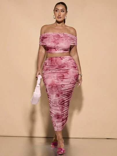 SHEIN BAE Retro Romantic All-Over Floral Print Two-Piece Set. Off Shoulder Strapless Pleated Mesh Top And Pleated Mid-Length Skirt. Elegant Women's Two-Piece Set Suitable For Dates, Vacations And Birthday Parties. - Pink - View 1