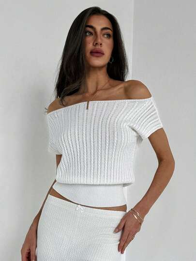 Aloruh Elegant White Women's T-Shirt With Textured Summer Knit And Bodycon Silhouette, Can Be Worn Two Ways,Off The Shoulder Sweater - White - View 1