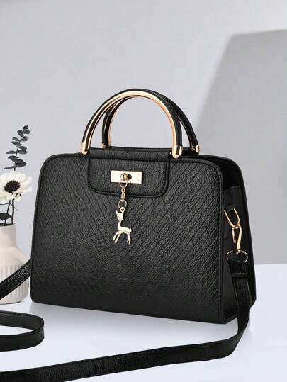 2pcs/Set Spring New Fashion PU Leather Handbag, Includes 1 Medium Shoulder Bag Suitable For Women & Girls As A Stylish Minimalist Commuter Bag, Decorated With Scarf, Business Casual Tote Bag, Perfect For Office, Business And Work Occasions, Ideal For Everyday Elegance And Special Events, Also The Best Mother's Day Gift. - Black - View 1