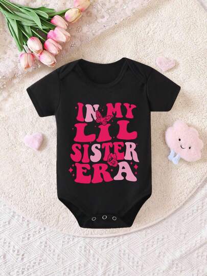 Baby Girls Cute Cartoon Butterfly Colorful Letters Slogan Printed Triangle Bodysuit Short Sleeve - Black - View 1
