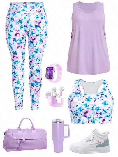 Easithlete Plus Floral Print Sports Set With Tank Top For Dailywear Airport Outfit - Multicolor - View 1
