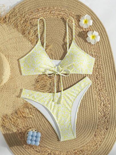 SHEIN Swim Women's Summer Beach Floral Printed Front Tie Sexy Bikini Set, Random Print - Yellow - View 1
