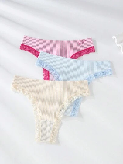 3pack Comfortable Contrast Lace Trim Ribbed Thong - Multicolor - View 5