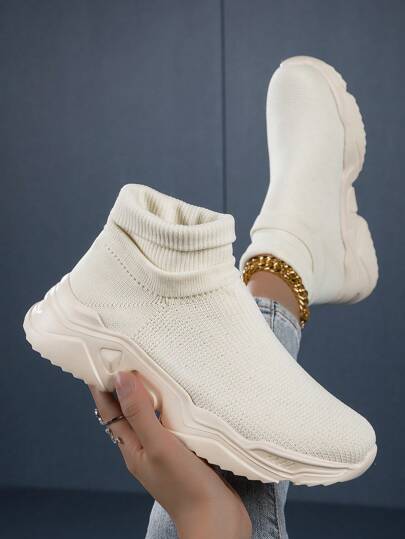 Women's Fashionable  Mid-Top Socks Sneakers, Convenient Slip-On Knitted Shoes With Mesh And Thick Sole, Lightweight And Comfortable For Walking, Super Breathable And Stylish - Beige - View 1