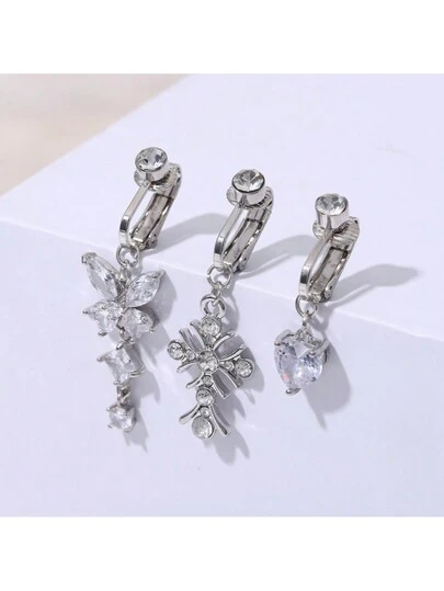 3pcs Women's Gift Stainless Steel Belly Button Ring Set, Non-Piercing Fake Navel Rings With Copper Inlaid Cubic Zirconia, Heart, Butterfly, And Cross Elements, Sexy Body Jewelry Valentines,Mom,Mother,Mother's Day,Gift - Silver - View 1