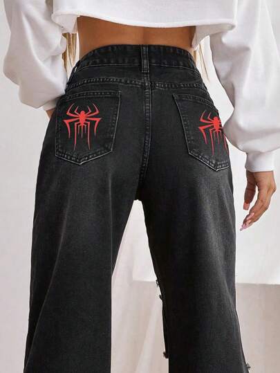 SHEIN EZwear Women Spider Print Pocketed Washed Loose Fit Wide Leg Jeans - Black - View 1