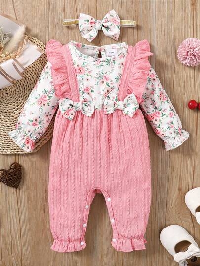 Baby Girl's Ditsy Floral Jumpsuit With Detachable Bib And Headband, Autumn - Pink - View 1