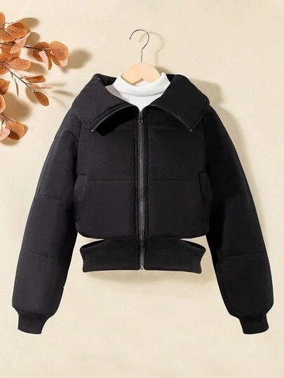 Solid Color Front Zipper Hollow Casual Long Sleeve Jacket - Black - View 1