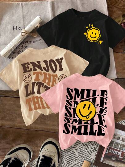 SHEIN Leap Crew 3pcs Tween Girls Casual Loose Cartoon Smile & SMLLE Letter Graphic Round Neck Short Sleeve T-Shirts, Suitable For Summer - Multicolor - View 1