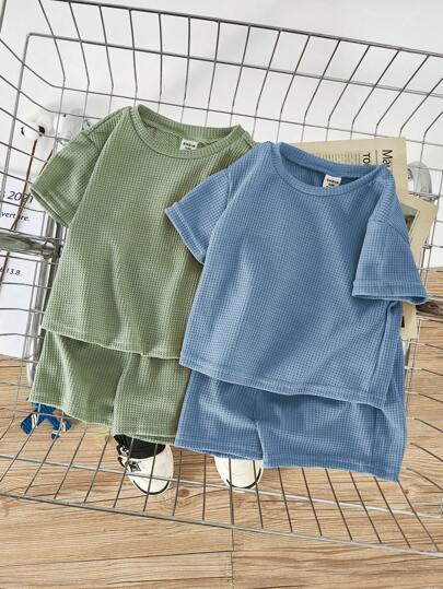 Baby Boy 4pcs Hazy Blue And Mint Green Solid Color Raglan Loose Sweatshirt And Casual Shorts Set - Multicolor - View 1