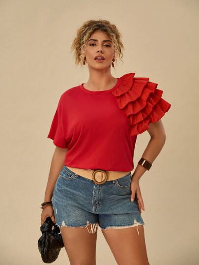 Travachic Plus Size Flounce Hem Short Sleeve Casual T-Shirt - Red - View 1