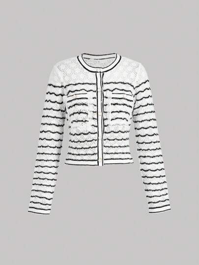 SHEIN MOD Black & White Striped Form-Fitting Round Neck Ladies Knitted Cardigan Sweater, Women's Cable Knit Long Sleeve Shrug White Knitted Sweater,Fall Clothes,