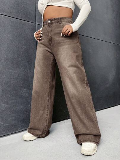 SHEIN EZwear Plus Size Women's Solid Color Minimalist Everyday Jeans - Coffee Brown - View 1