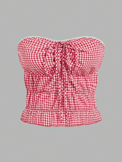 Sweetra Plus Size Red Plaid Tube Top - Fashionable, Sexy Checkered Bow Tie Sweet Cropped Bandeau Top For New Year, For Summer - Red - View 4