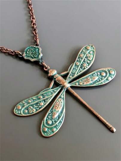 1pc Vintage Bohemian Style Green Dragonfly Design Pendant Necklace, Suitable For Women Party Travel Jewelry Gift - Green - View 1