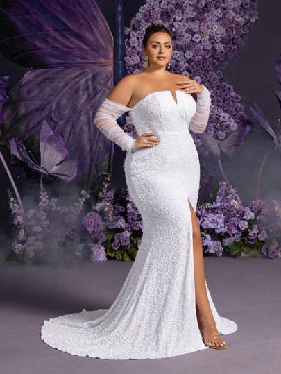 Faeriesty Plus Off Shoulder Sequined Mermaid Hem Wedding Dress, Plus Size White Elegant Long Sleeve Bridal Dress - White - View 1