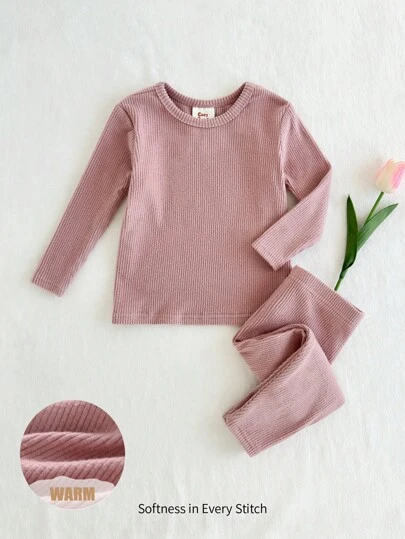 Cozy Pixies 2pcs Baby Girl Solid Color Knit Soft Crew Neck Long Sleeve Top And Fitted Pants Pajama Set - Pink - View 1