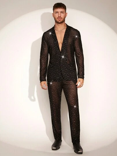 FeverCity 2pcs Men's Mesh Rhinestone Lapel Neck Long Sleeve Suit Jacket And Pants Party Outfit Set - Black - View 1