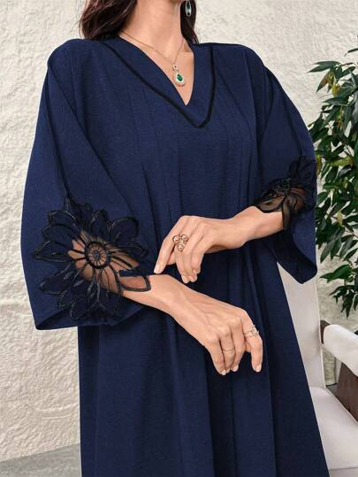 Al Najma Women's Elegant Floral Embroidered Batwing Sleeve Dress, Spring Summer, Modest Arabian Dress Kaftan Jalabiya Dress - Navy Blue - View 4