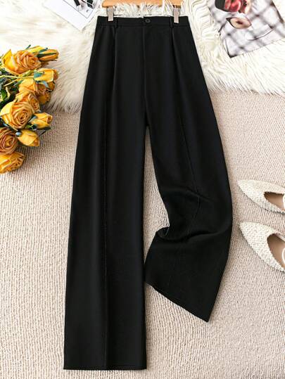 SHEIN LUNE Plus Size Casual Solid Color Straight Leg Pants - Black - View 1