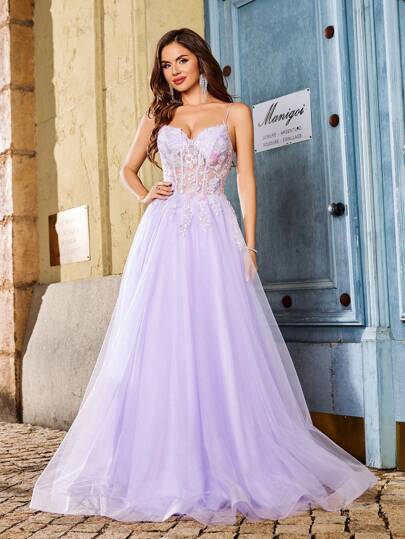 3D Flower Beads Sequin Appliques Ball Gown Mesh Prom Dresses Long Spaghetti Strap V-Neck Elaborate Formal Evening Party Gowns Homecoming Wedding Guest Dress - Mauve Purple - View 1