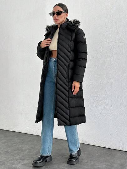 EURMUSE Fur And Zipper Added Padded Long Padded Winter Coat - Black - View 1