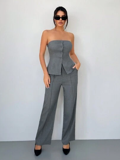 SHEIN Tall Women's Strapless Suit Set, Grey, For Office Wear & Teacher Outfits - Dark Grey - View 1