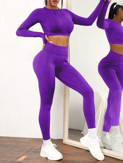 Easithlete Women Solid Color Seamless Form Fit Long Sleeve Crop Top And Leggings Sports Suit Workout Women Set Women Leggings Set - Purple - View 1